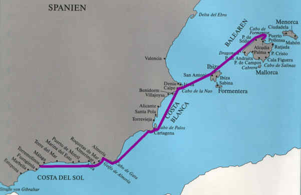 Mallorca und Ibiza erreichten wir mangels Wind unter Motor nach 210 sm unter Motor Altea.
